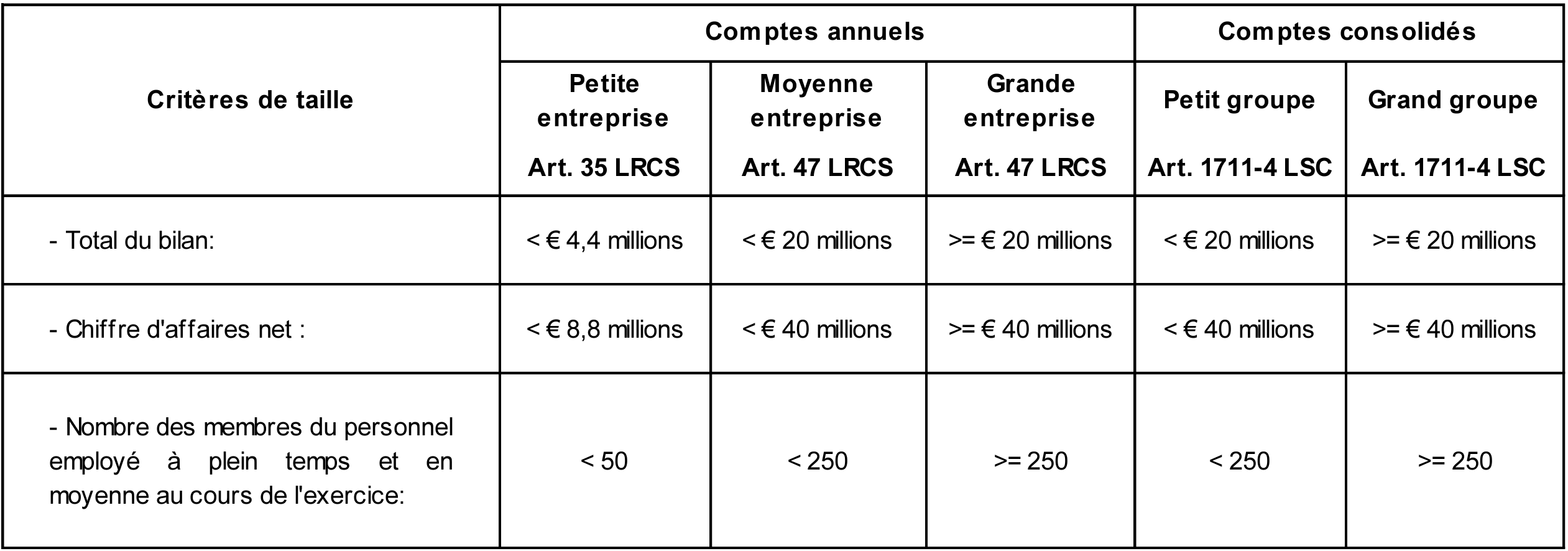Les entreprises sont catégorisées en « petite entreprise » (art. 35 LRCS), « moyenne entreprise » (art. 47 LRCS) et « grande entreprise » sur base de trois critères de taille, à savoir le « total de bilan », le « chiffre d’affaires » et le « personnel employé ». De même, la catégorisation en « petit groupe » ou en « grand groupe » (art. 1711-4 LSC) s’opère également suivant ces trois critères de taille (considérés sur base consolidée ou agrégée) afin de déterminer l’existence de l’obligation légale d’établir et de publier des comptes consolidés.