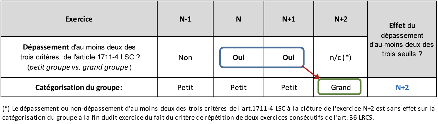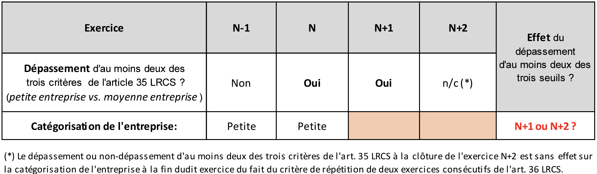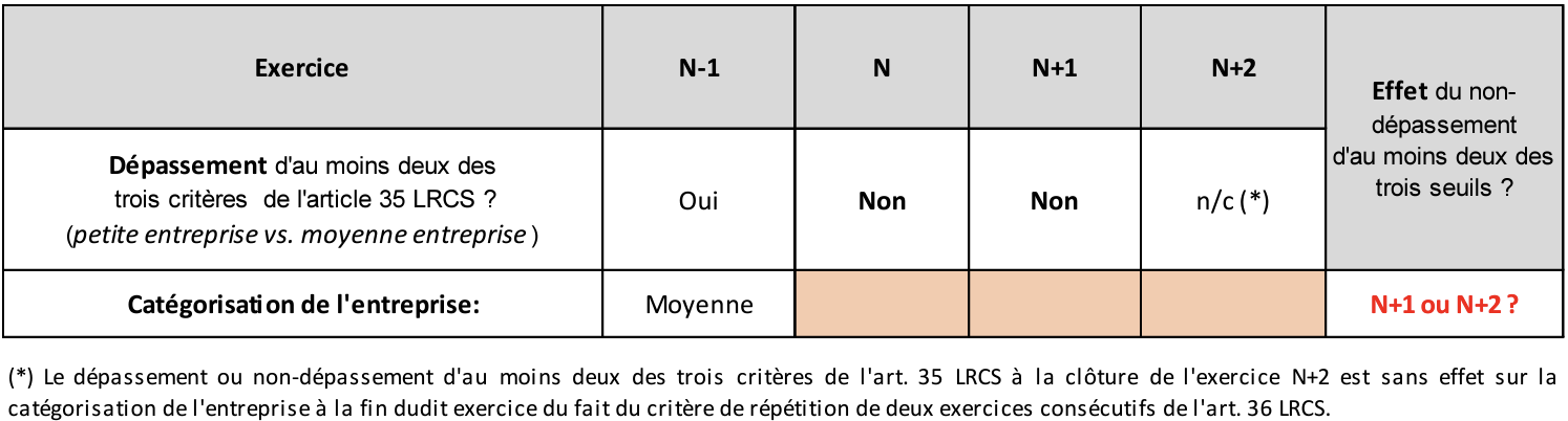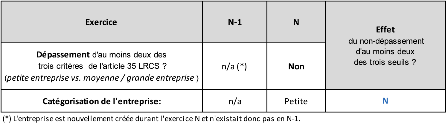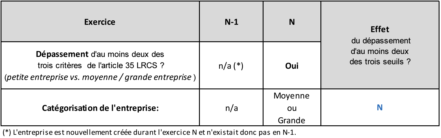 Afin d’illustrer ce premier cas, prenons la situation de l’entreprise A catégorisée en « petite entreprise » et qui lors de l’exercice N-1 ne dépassait pas deux des trois critères de l’article 35 LRCS.