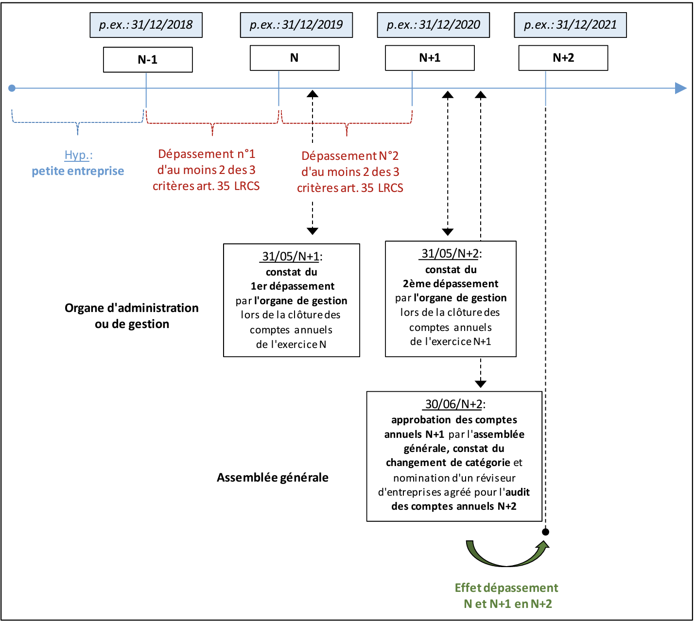 Il en résulte que le deuxième dépassement des critères de taille durant l’exercice N+1 ne sera formellement constaté que lors de la réunion de l’organe d’administration ou de gestion arrêtant les comptes annuels de l’exercice N+1 tenue en amont de l’assemblée générale approuvant lesdits comptes et dont la loi prévoit qu’elle doit se tenir au plus tard le 30 juin N+2. Constatant que l’entreprise A vient de dépasser pour le deuxième exercice consécutif les critères de taille de l’article 35 LRCS, les organes de la société devront alors prendre les mesures qui s’imposent en relation avec le changement de catégorie de l’entreprise A, jusque lors « petite entreprise » et désormais « moyenne entreprise ». Parmi les mesures à prendre figurent la nomination d’un réviseur d’entreprises agréé, nomination qui relève, sauf exception, de la compétence de l’assemblée générale des actionnaires ainsi que l’établissement d’un rapport de gestion et de comptes annuels suivant un modèle développé. Or, d’un point de vue pratique, ces mesures ne sauraient avoir un effet sur l’exercice N+1 alors arrêté et en cours d’adoption par l’assemblée générale. En conséquence, ces mesures ne pourront généralement s’appliquer que pour l’avenir à savoir aux comptes annuels de l’exercice N+2 (cf. : Fig.1.2. ci-dessous).