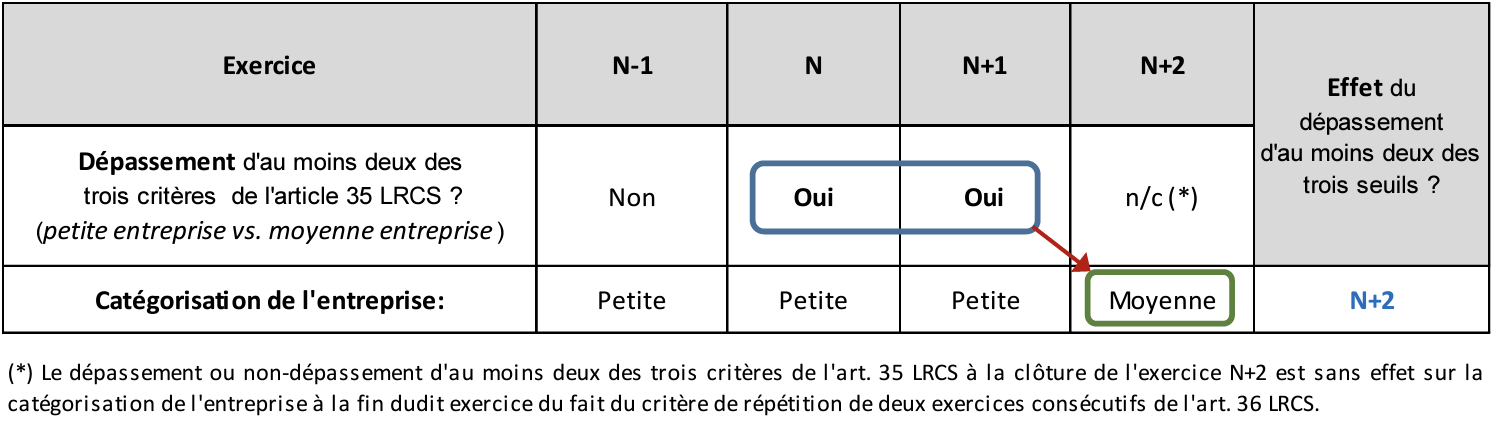 En premier lieu, il apparaît clairement que le dépassement des critères de taille ne produirait aucun effet aux termes de l’exercice N dans la mesure où l’entreprise A vient alors à dépasser pour la première fois deux des trois critères de taille de l’article 35 LRCS et que, par conséquent, elle ne remplit pas alors le critère de répétition de l’article 36 LRCS. L’entreprise A demeurerait dès lors une « petite entreprise » à l’issue de l’exercice N.