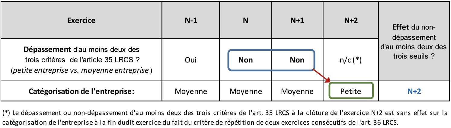 Ainsi, s’il apparaît clairement qu’aux termes de l’exercice N, aucun changement de catégorie n’interviendra en l’absence de critère de répétition (premier « non-dépassement »), la question se pose pour l’exercice N+1. Au terme de l’exercice N+1, le deuxième « non-dépassement » consécutif est en effet constaté. Cependant, par symétrie avec l’approche retenue en cas de dépassement, le « non-dépassement » constaté aux termes de l’exercice N+1 ne produira ses effets que durant l’exercice N+2.