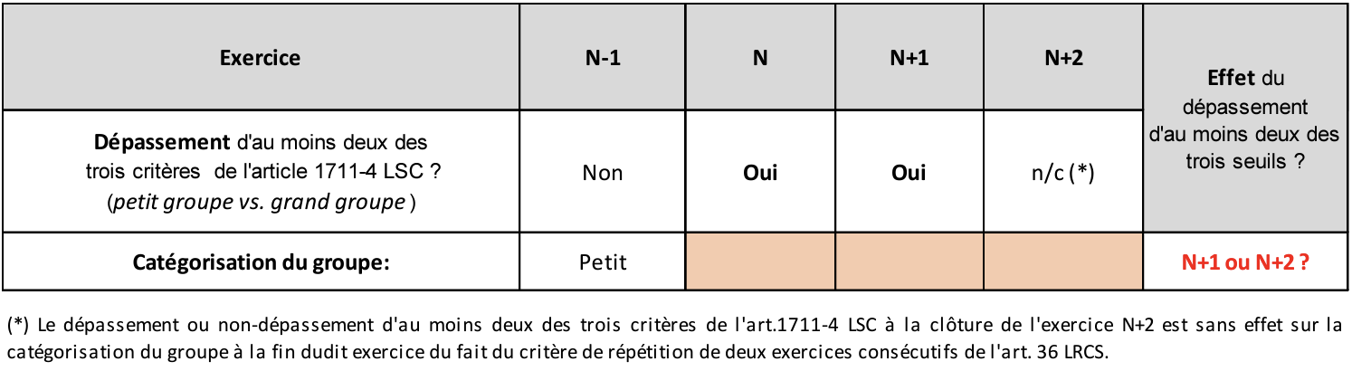 Imaginons à présent deux situations, la première où le groupe E ne dépasse pas deux des trois critères de taille visés à l’article 1711-4 LSC au terme de son premier exercice N et la seconde où le groupe E dépasse deux des trois critères de taille dès son premier exercice (N).
