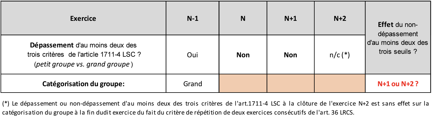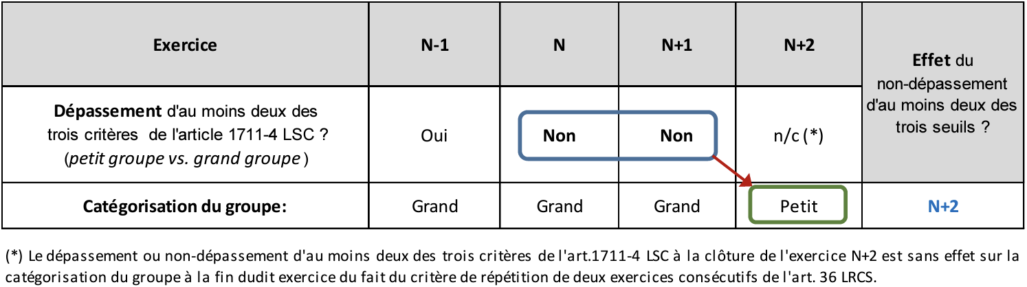 La rédaction de l’article 36 LRCS pose le principe d’un parallélisme entre les conditions et les effets du dépassement et du non-dépassement des critères de taille, le critère de répétition de deux ans s’appliquant dans les deux cas. Dès lors, la CNC est d’avis qu’il y a lieu d’opérer un raisonnement symétrique en considérant que la prise d’effet du « non-dépassement » n’intervient que durant l’exercice suivant celui aux termes duquel le constat de « non-dépassement » a été opéré.