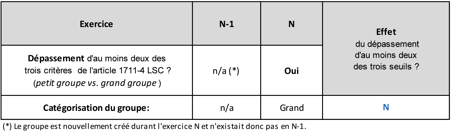 Dans le cas où, sur base d’une estimation de bonne foi, le nouveau groupe E ne dépasserait pas lors de son premier exercice deux des trois critères de taille de l’article 1711-4 LSC, la CNC est d’avis que celui-ci devrait alors être rangé lors l’exercice N (premier exercice) dans la catégorie des petits groupes (cf. : Fig. 5.1.).