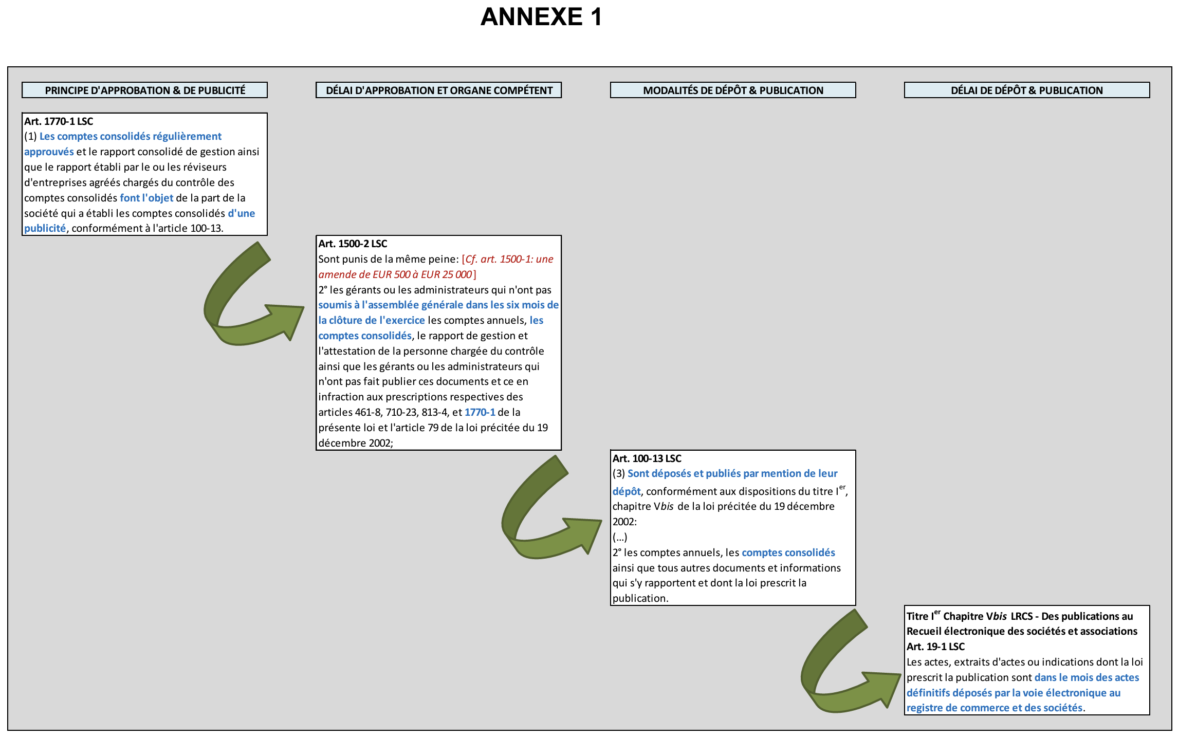 Le titre XVII LSC « Des comptes consolidés » pose le principe dans son article 1770-1, paragraphe 1er LSC d’une publication des comptes consolidés régulièrement approuvés sans toutefois préciser le délai d’approbation. La section XV LSC « Dispositions pénales » vient clarifier ce point en disposant dans son article 1500-2, point 2° LSC que sont passibles d’une amende de EUR 500 à EUR 25 000 les gérants ou les administrateurs qui n’ont pas soumis les comptes consolidés à l’assemblée générale dans les 6 mois de la clôture de l’exercice.