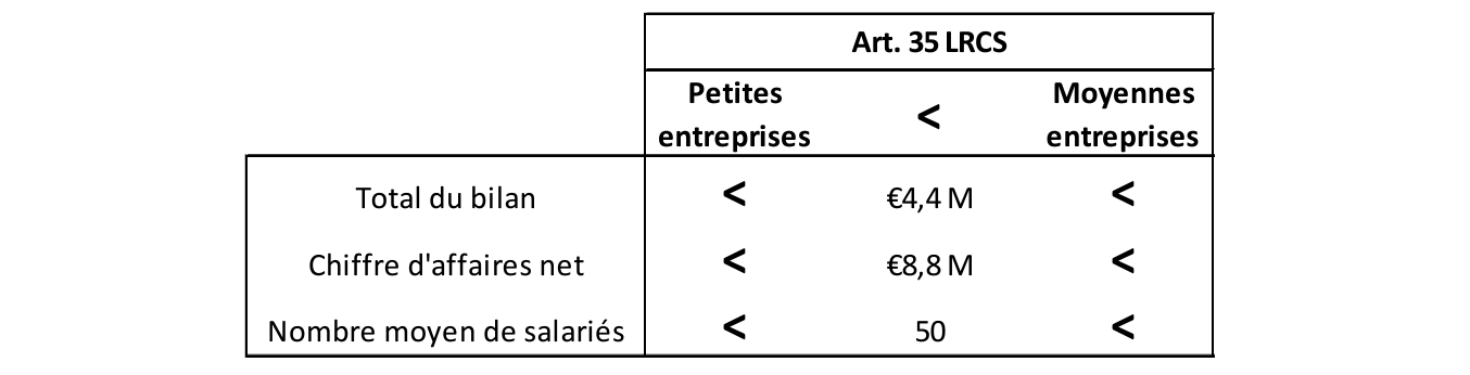 Il en résulte que les petites entreprises – définies au Luxembourg comme celles ne dépassant pas deux des trois critères visés à l’article 35 LRCS (cf. : Fig. 2 ci-après) pendant deux exercices consécutifs – sont dispensées de faire mention dans l’annexe de leurs comptes annuels de l’information requise à l’article 65 (1) 2° LRCS concernant certaines participations détenues.