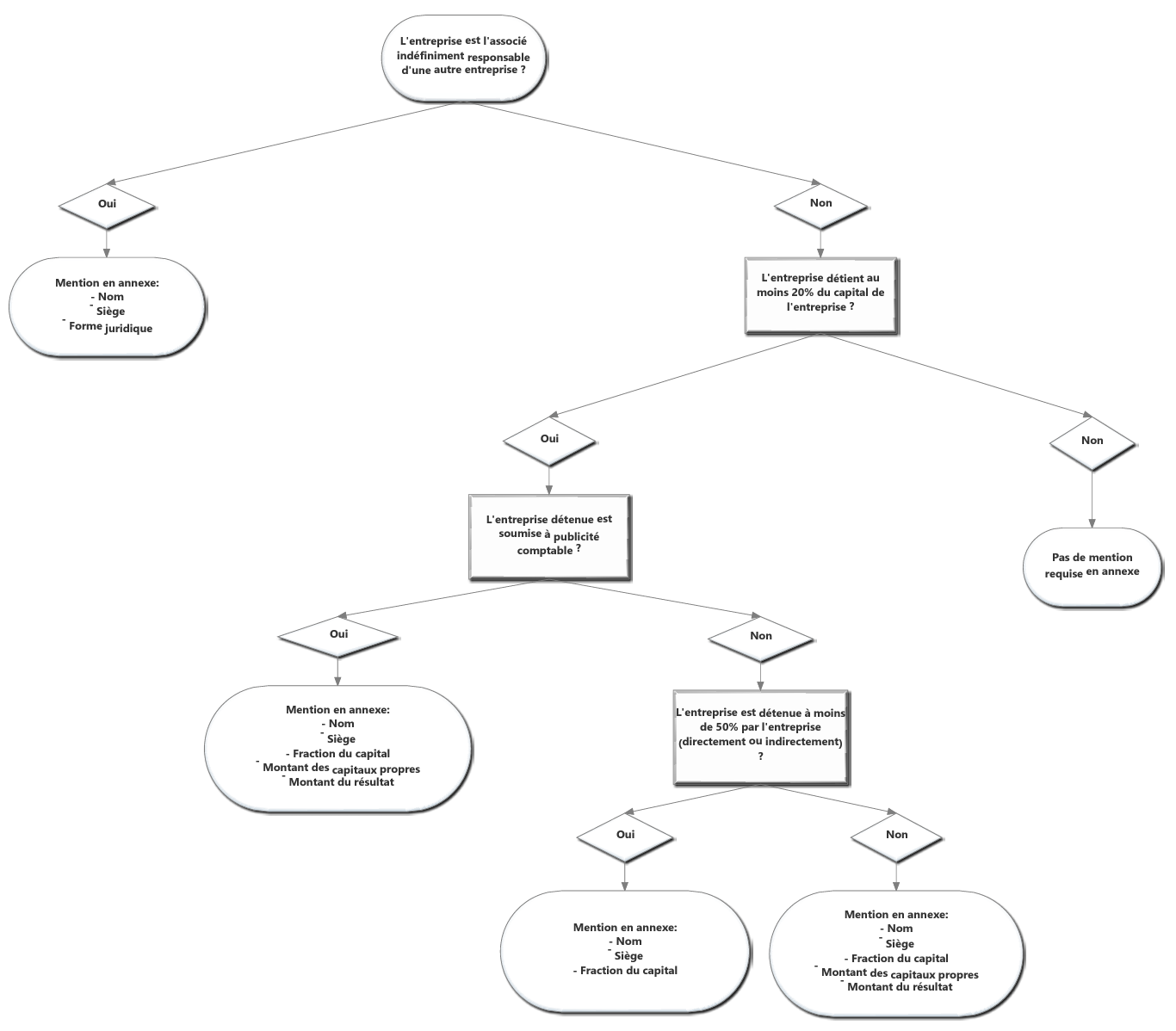 Lorsque l’entreprise encourt une responsabilité illimitée à raison de sa participation dans une autre entreprise, l’annexe de ses comptes annuels doit renseigner – sans considération du pourcentage de détention (p.ex. : < 20%) – les informations suivantes :